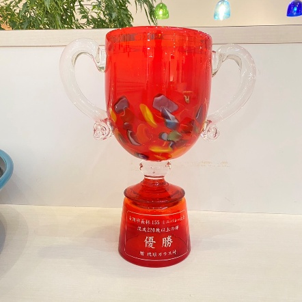 今日まで「混成220歳以上の部」の優勝杯がなく、大会の盛上りにかけていましたが、20回大会を記念して琉球ガラス村より優勝杯の寄贈がありました。会員一同心から感謝申し上げます。なお、開会式に先立ち賀数顧問兼副会長より優勝杯のお披露目を行いました。